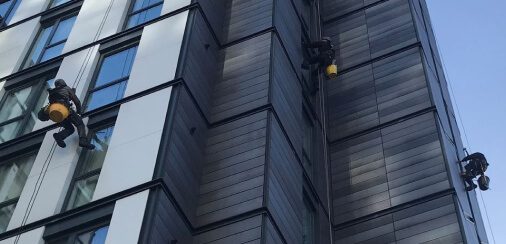 JH Cleaning Services can offer abseiling and rope access window cleaning services to all high level commercial and residential buildings. We are fully insured and committed to providing a safe working environment. All our teams are trained to IRATA level 2 and 3 standards and are fully supervised at all times.